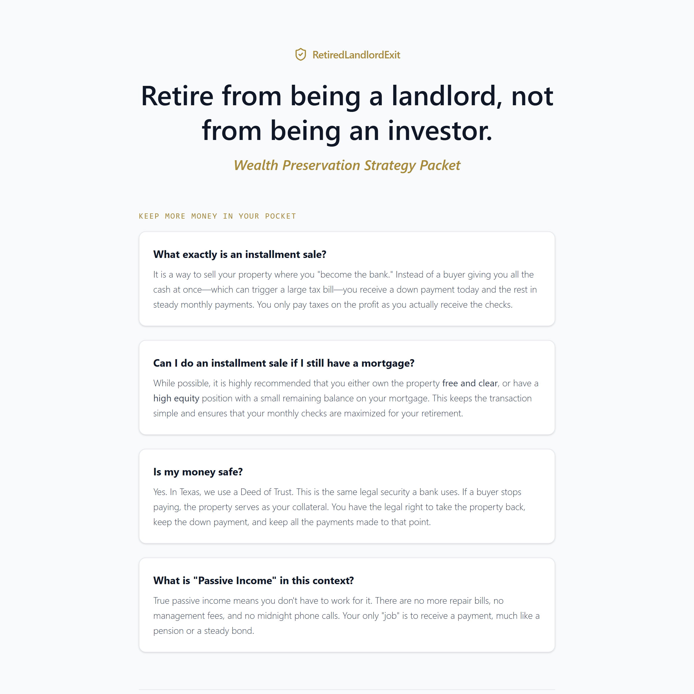 A clear breakdown of frequently asked questions, plus five specific questions to ask your tax professional-designed to help determine if an installment sale is the right exit strategy for your Texas property.